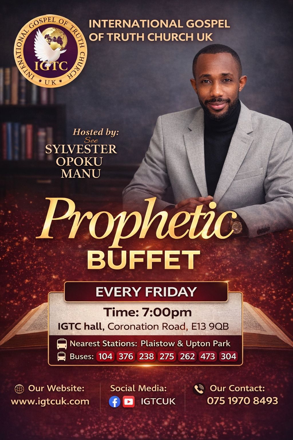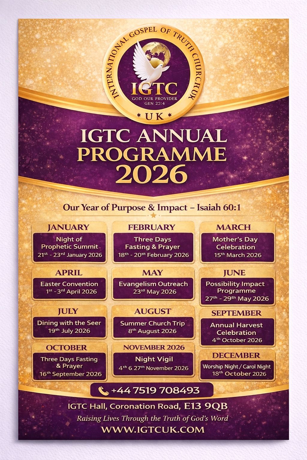 “Welcome to International Gospel Of Truth Church. We are a Community who firmly believes in Gods word. IGTC is a land of possibilities. As a family and multicultural church, we have grown over the years touching lives and restoring destinies. It is indeed a joy to see that you have taken time to visit our new church website.”